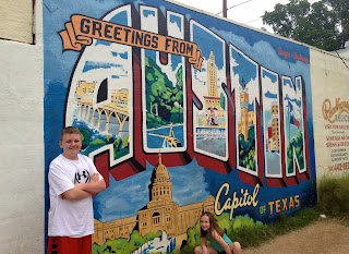 We were all getting hungry for supper so we decided to head toward the food truck area of town. Christy had recommended a doughnut food truck and we knew we wanted to stop there. The traffic was crazy but we finally made it to the food trucks. We stopped for a picture with the Austin mural and began deciding what to eat. There was a food truck called Torchy's Tacos that looked like something we would all like. The food was delicious. All the salsas we had in Austin and San Antonio put the kind we get at restaurants here in Missouri to shame. After some tacos we headed to try the doughnuts. They were huge and really could have been a meal in themselves. Ella and I shared one with fresh strawberries and cream cheese frosting that was delicious. John had a cinnamon and sugar doughnut and Sam had one with maple syrup icing and slices of bacon. He loved it!